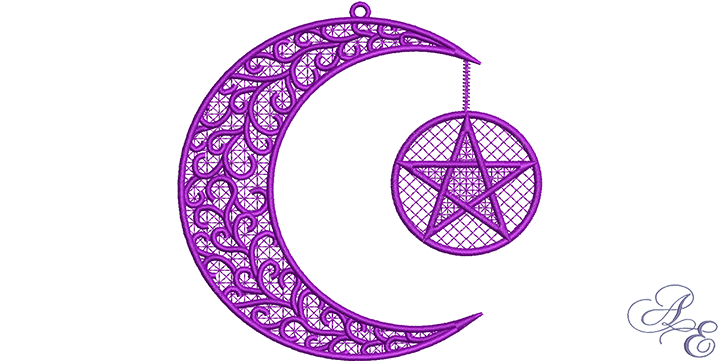 A free-standing lace design of a pentacle hanging from a curly crescent moon.